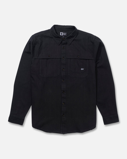 The Long Haul L/S Shirt in Phantom features a mid-weight 185 gsm herringbone twill fabric, offering durability and comfort. Designed with outdoor-inspired front yoke and chest pockets, it combines functionality with style. The shirt includes a woven label on the left chest pocket and branded resin buttons, enhancing its refined details. A soft hand garment wash ensures a comfortable feel, making it ideal for extended wear in various conditions.